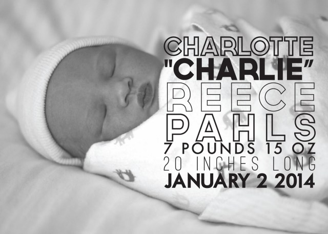 She’s here! She’s here! Our beautiful Charlotte Reece was born January 2 at 2:21 pm weighing 7lbs 15oz and 20 inches long. Based on how big my belly was, I was sure she was at least an 8lb baby, but she was just right! Our sweet Norah is down for a nap and Charlie is snuggled up asleep as well. As I look at my two beautiful daughters, and am overwhelmed with how blessed Chris and I are. We have joked since we were 20 years old about having two beautiful daughters we were once told Chris would give me, another story for another time, but they are here!!! We are SO in love!